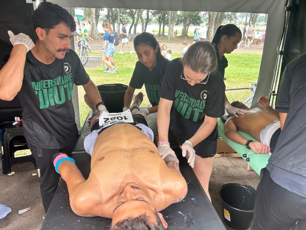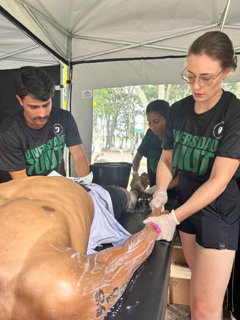 Durante o evento, os estudantes da graduação em Fisioterapia da Tuiuti contribuíram com o atendimento aos atletas, realizando exercícios de liberação muscular, técnica importante para auxiliar na recuperação após o esforço físico intenso característico desse tipo de competição.